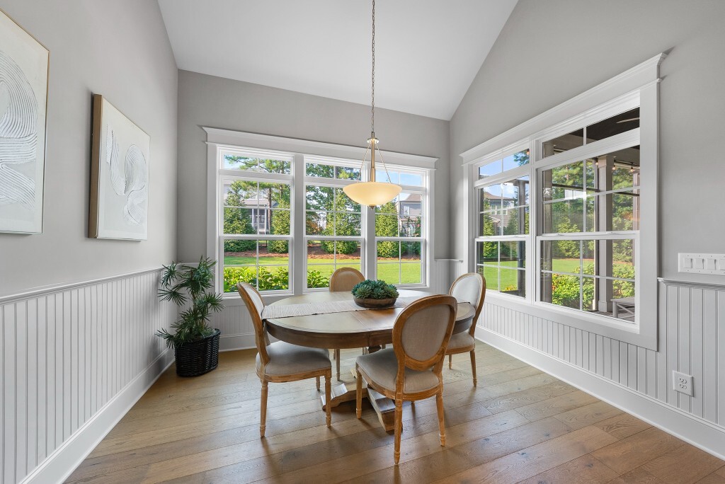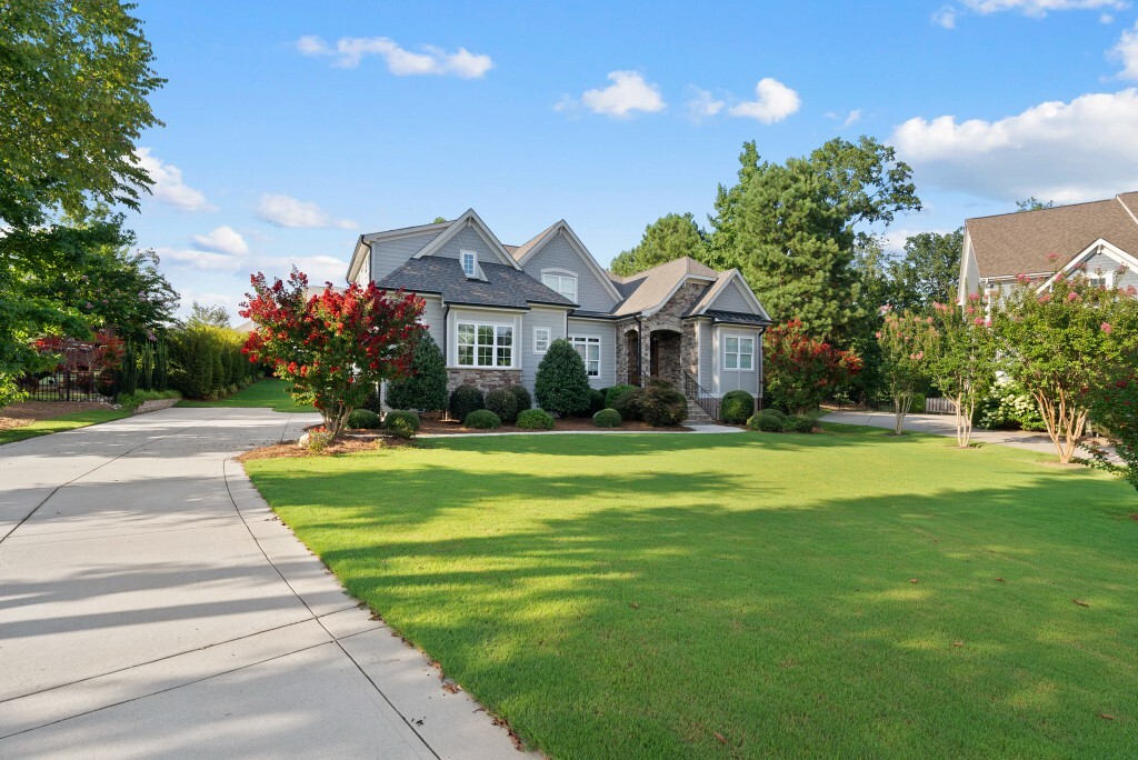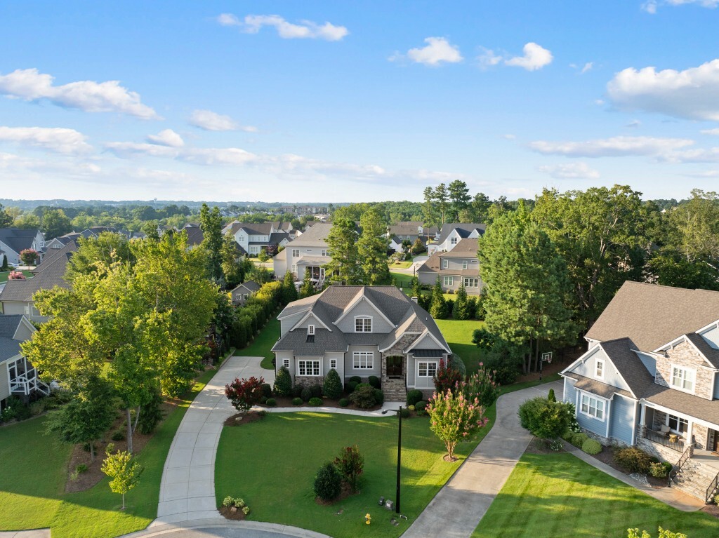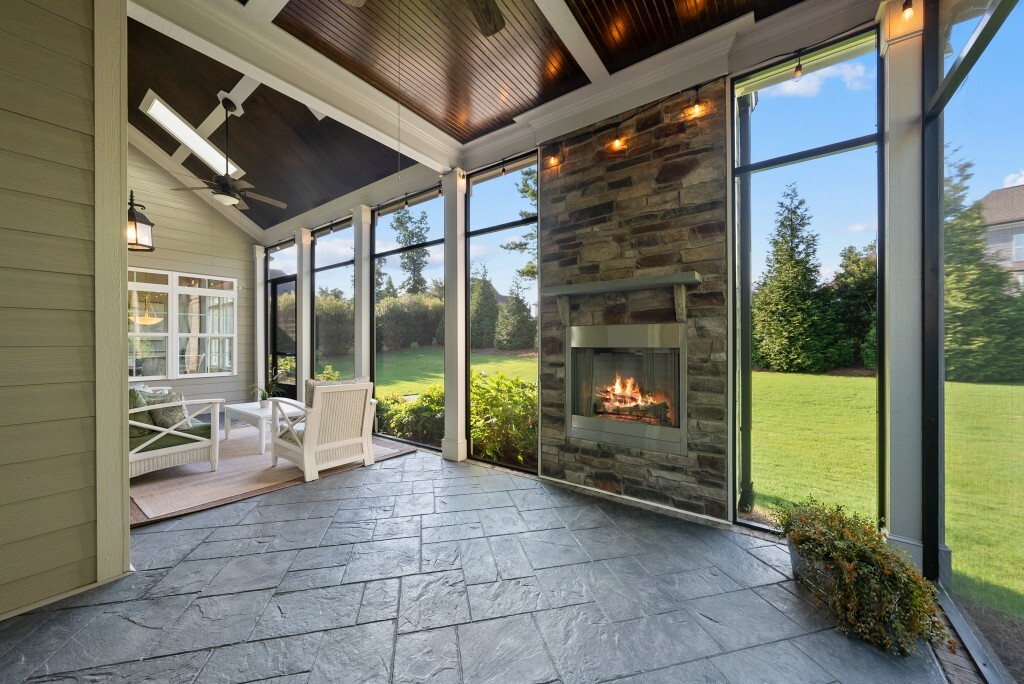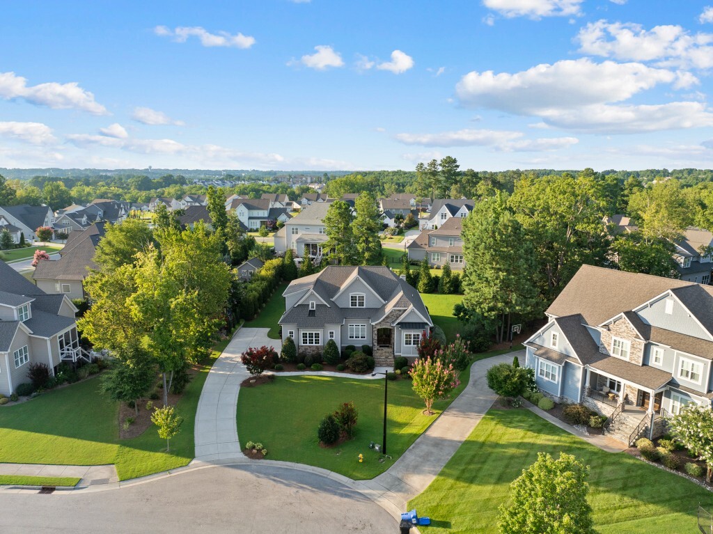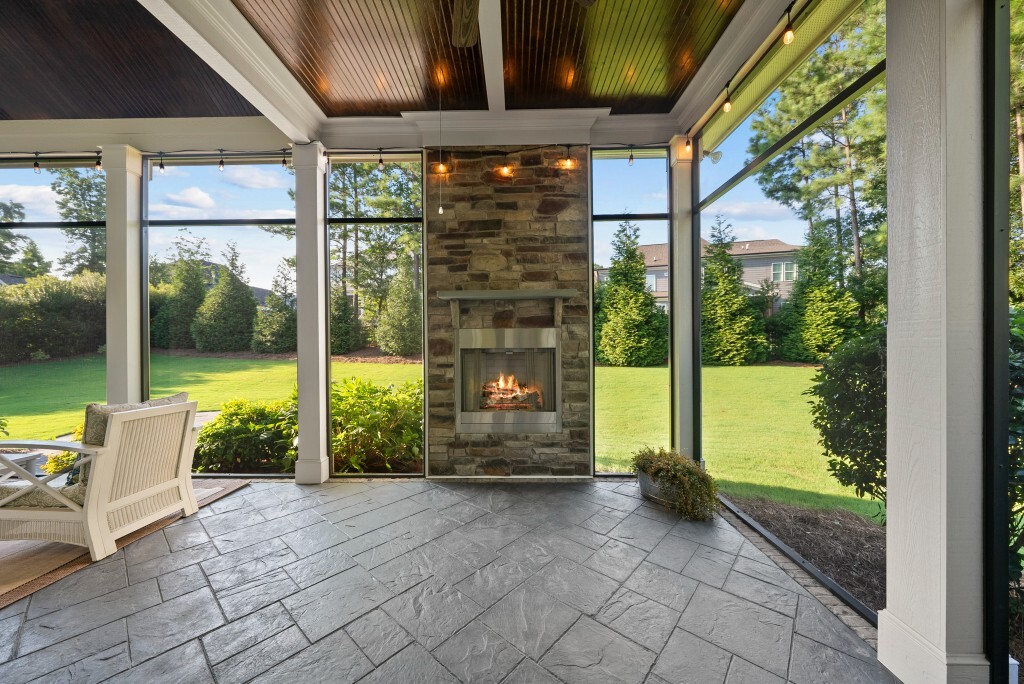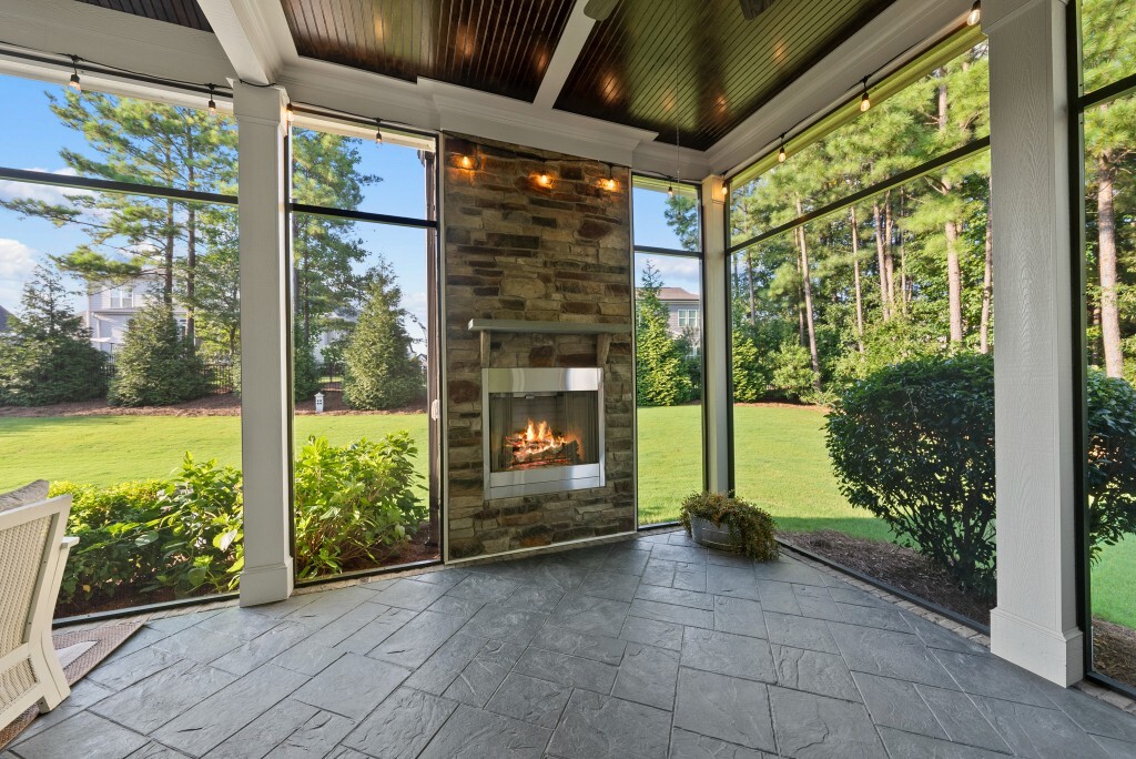 Step into luxury living in the Stonewater community of Wake Forest—an upscale enclave featuring custom-built homes on generous wooded lots. The exterior boasts stone accents, crisp architectural lines, and manicured landscaping, creating exemplary curb appeal. Inside, stunning hardwood flooring, crisp trim work, coffered ceilings, wainscoting, and built‑ins elegantly frame formal and casual space. The formal dining room impresses with abundant natural light, fine millwork, and chandelier lighting—perfect for hosting special gatherings. Also featured is a dedicated home office or study with serene views, ideal for remote work or quiet reflection. The expansive great room showcases built-ins flanking a gas fireplace, cathedral ceilings, and abundant natural light—designed to be the heart of the home. Nearby, a practical mudroom/drop‑zone with bench and cubbies offers smart storage solutions for busy family life. Experience seamless indoor-outdoor living with a screened porch that includes vaulted ceilings, ceiling fans, and an outdoor fireplace—overlooking a lush, private backyard perfect for year-round relaxing and entertaining. Within Stonewater, residents enjoy a wealth of amenities: a community pool, clubhouse, fully equipped fitness center, playground, and tranquil pond and greenway trails that connect throughout the neighborhood. The neighborhood offers easy access to: Major routes like US‑1, with commuting times to downtown Wake Forest (≈5 min), Raleigh (≈30 min), and RTP or RDU (≈30-35 min). Nearby attractions such as Falls Lake, E. Carroll Joyner Park, and nearby shopping/dining at Heritage and Wake Forest Crossing.