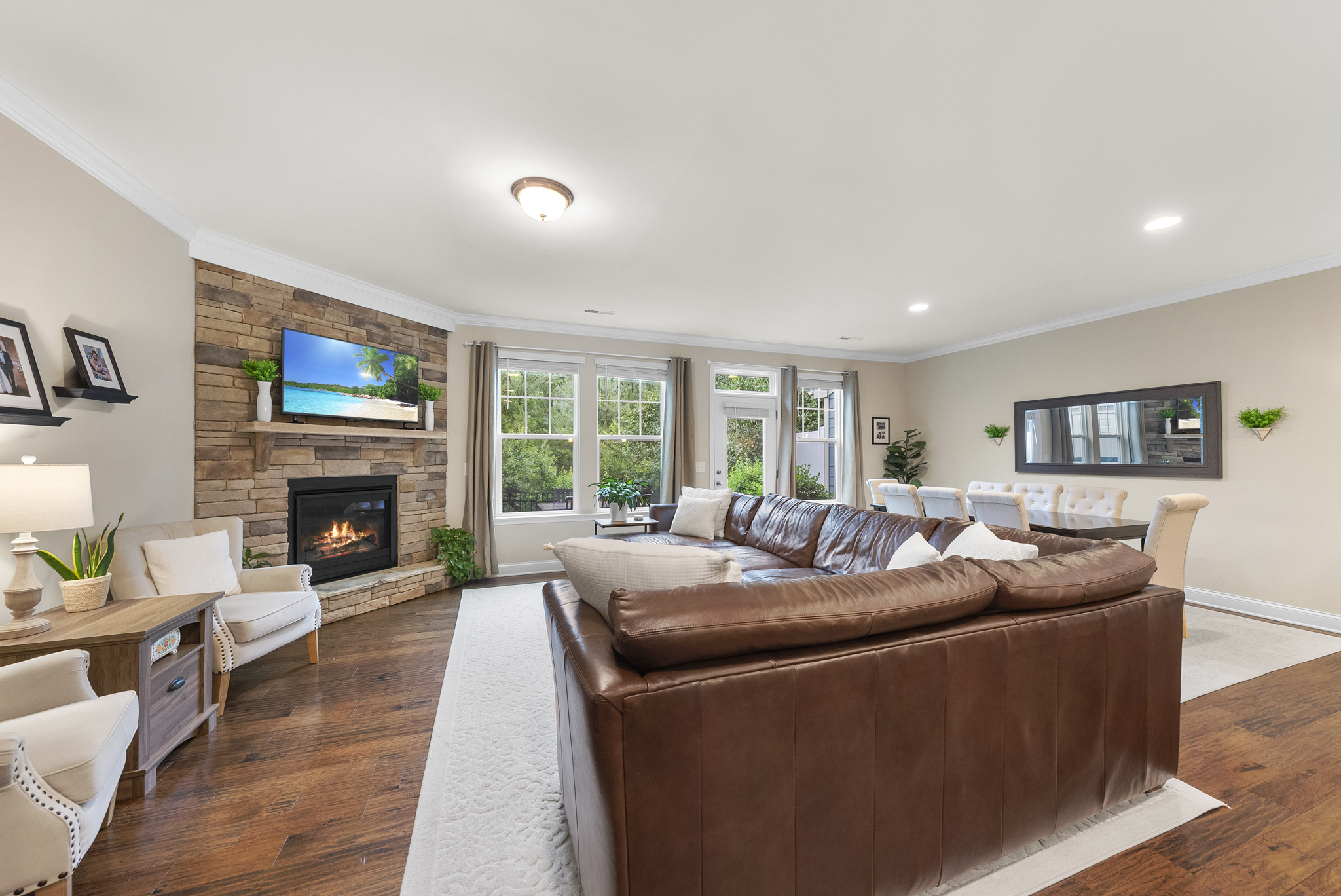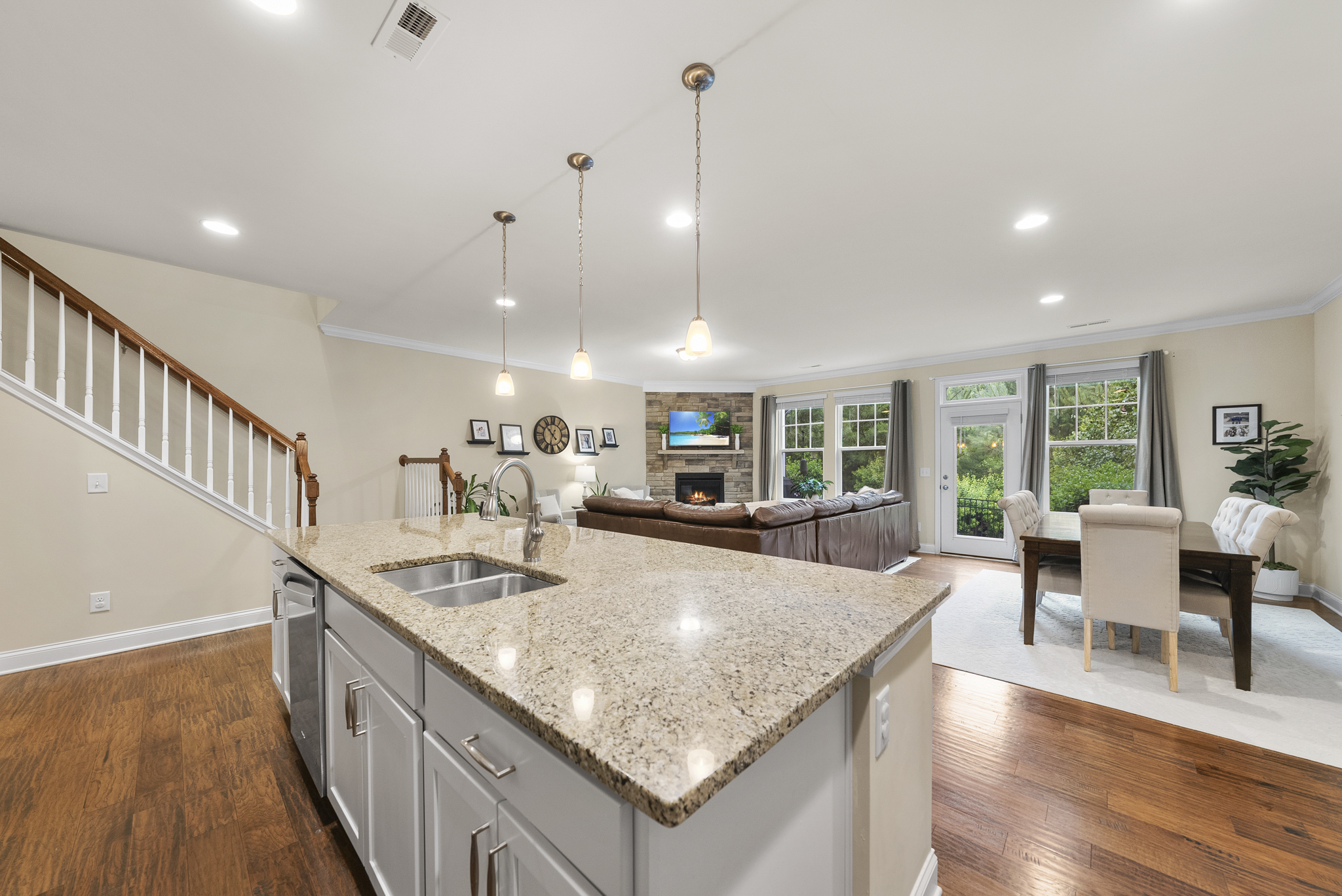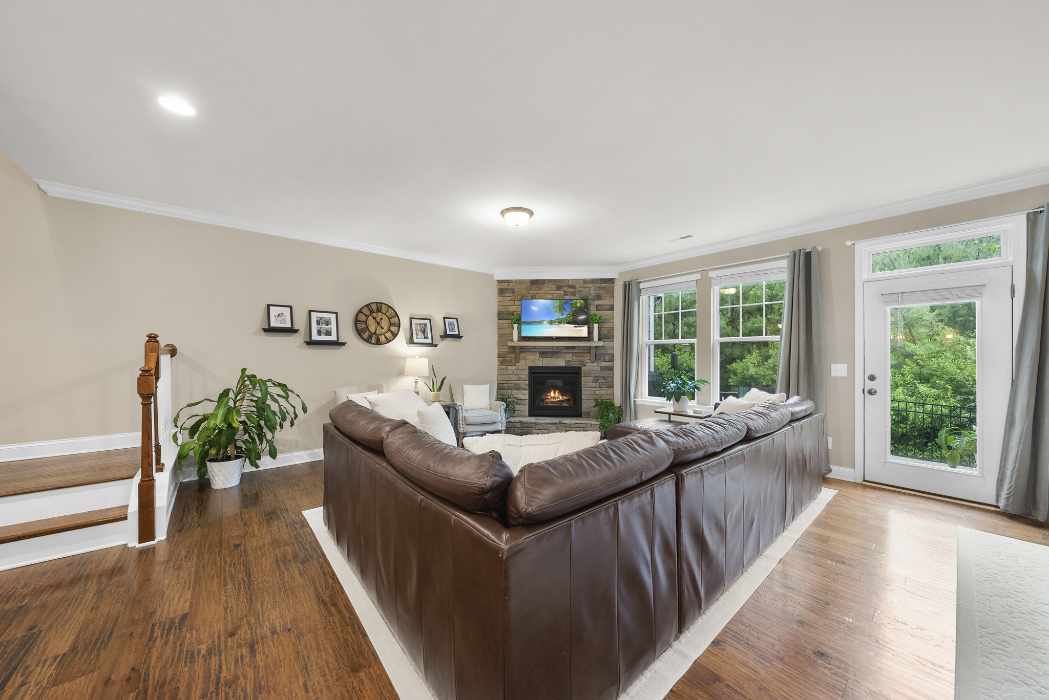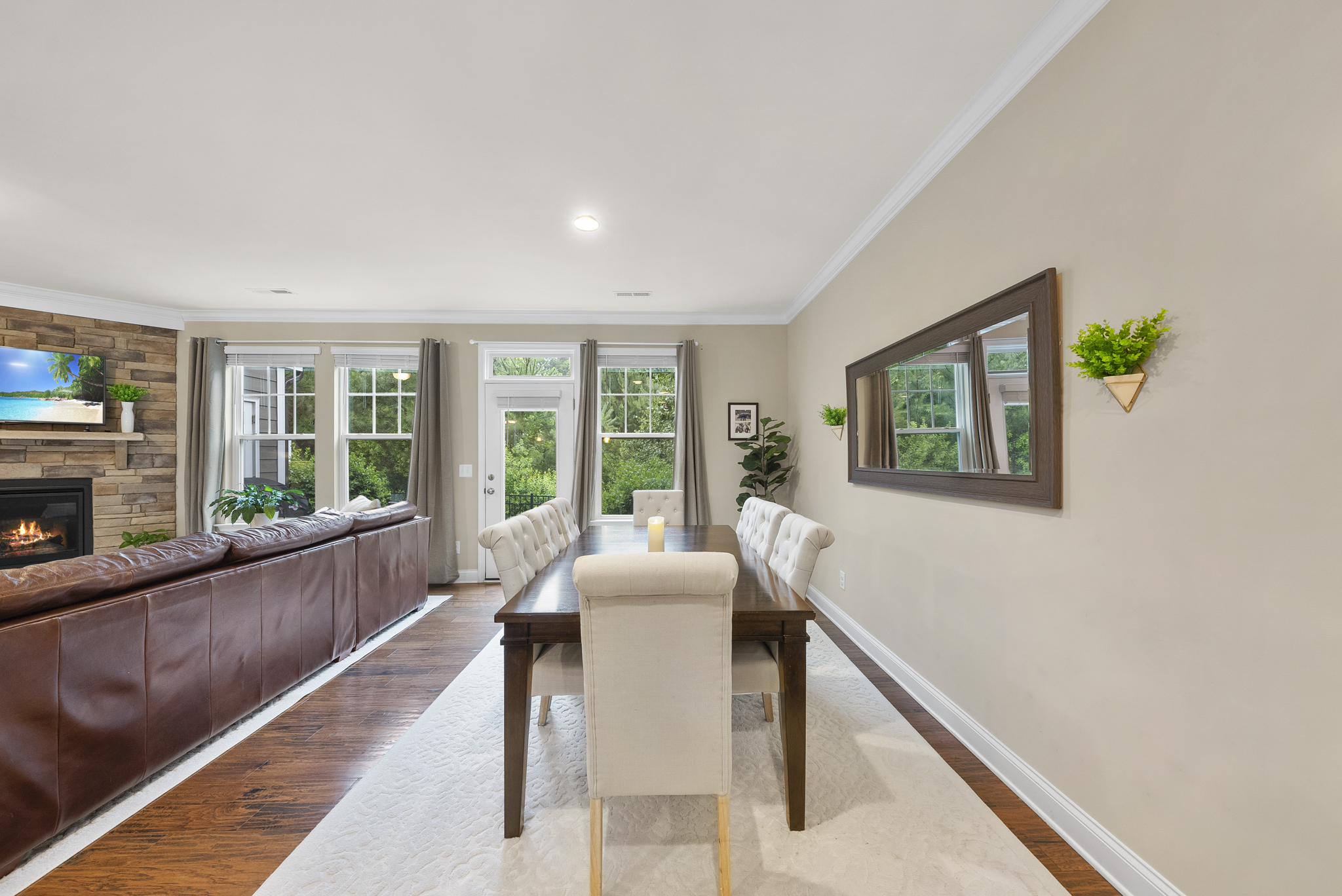Welcome to this beautiful 3-bedroom, 2.5-bath townhouse with bonus room and 2-car garage! Come inside and notice the beautiful hardwoods, crown molding, and an open layout. The kitchen offers a large center island, granite countertops, gas range, and stainless steel appliances. The spacious family room has abundant natural light and a stone gas-log fireplace. The dining area is perfect for guests and easily fits a full-size table. Rounding out the first floor, there is a drop zone/mudroom and a convenient half bath. Upstairs, the large primary suite boasts tray ceilings, big windows, and two walk-in closets. The large primary bath includes double vanities, a glass walk-in shower, and a private water closet. Two additional bedrooms feature ample closet space and share a full bath with dual vanities. A laundry room and a spacious bonus room complete the second floor. Out back, relax on the patio that backs up to a wooded area for added privacy. Additionally, there is an outdoor storage room attached. This amazing propertyy is in a great location near shopping, dining, entertainment and major Triangle thoroughfares! Don't miss this well kept and comfortable home!