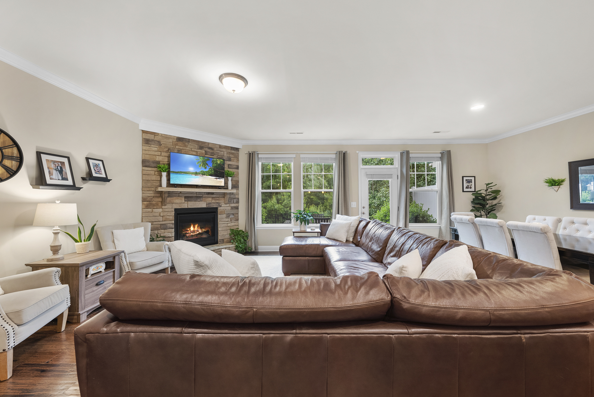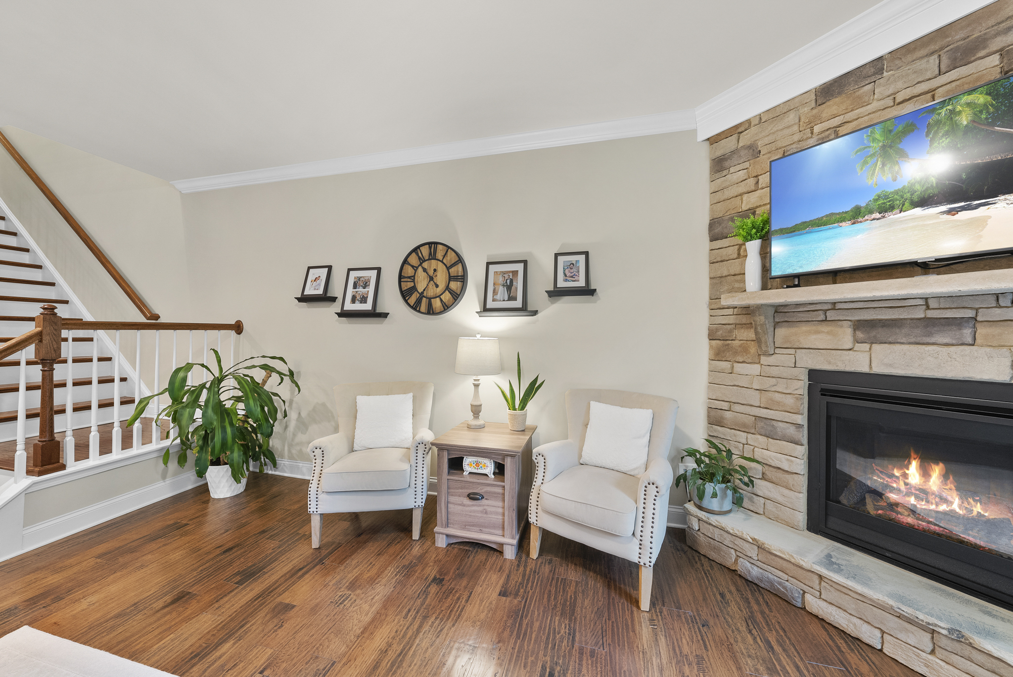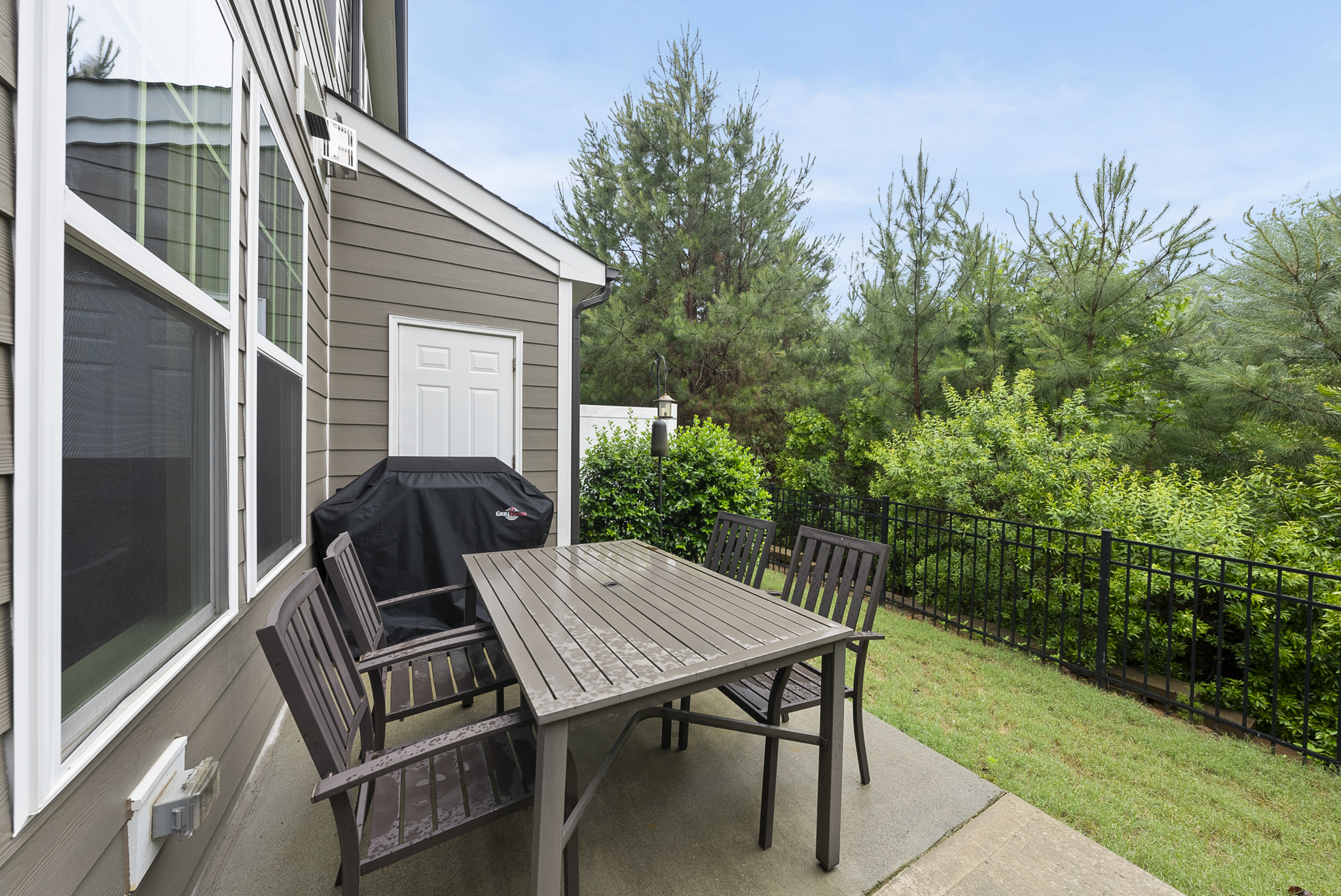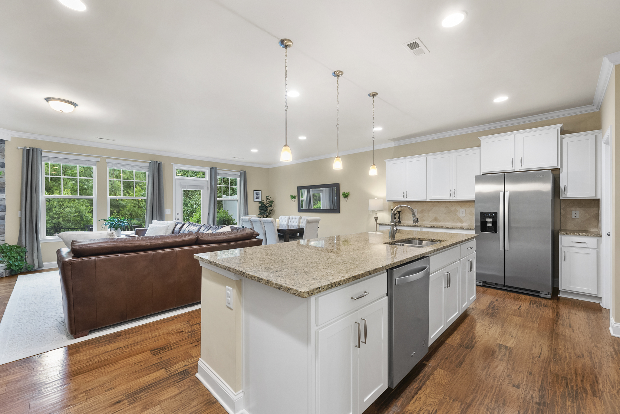 Welcome to this beautiful 3-bedroom, 2.5-bath townhouse with bonus room and 2-car garage! Come inside and notice the beautiful hardwoods, crown molding, and an open layout. The kitchen offers a large center island, granite countertops, gas range, and stainless steel appliances. The spacious family room has abundant natural light and a stone gas-log fireplace. The dining area is perfect for guests and easily fits a full-size table. Rounding out the first floor, there is a drop zone/mudroom and a convenient half bath. Upstairs, the large primary suite boasts tray ceilings, big windows, and two walk-in closets. The large primary bath includes double vanities, a glass walk-in shower, and a private water closet. Two additional bedrooms feature ample closet space and share a full bath with dual vanities. A laundry room and a spacious bonus room complete the second floor. Out back, relax on the patio that backs up to a wooded area for added privacy. Additionally, there is an outdoor storage room attached. This amazing propertyy is in a great location near shopping, dining, entertainment and major Triangle thoroughfares! Don't miss this well kept and comfortable home!