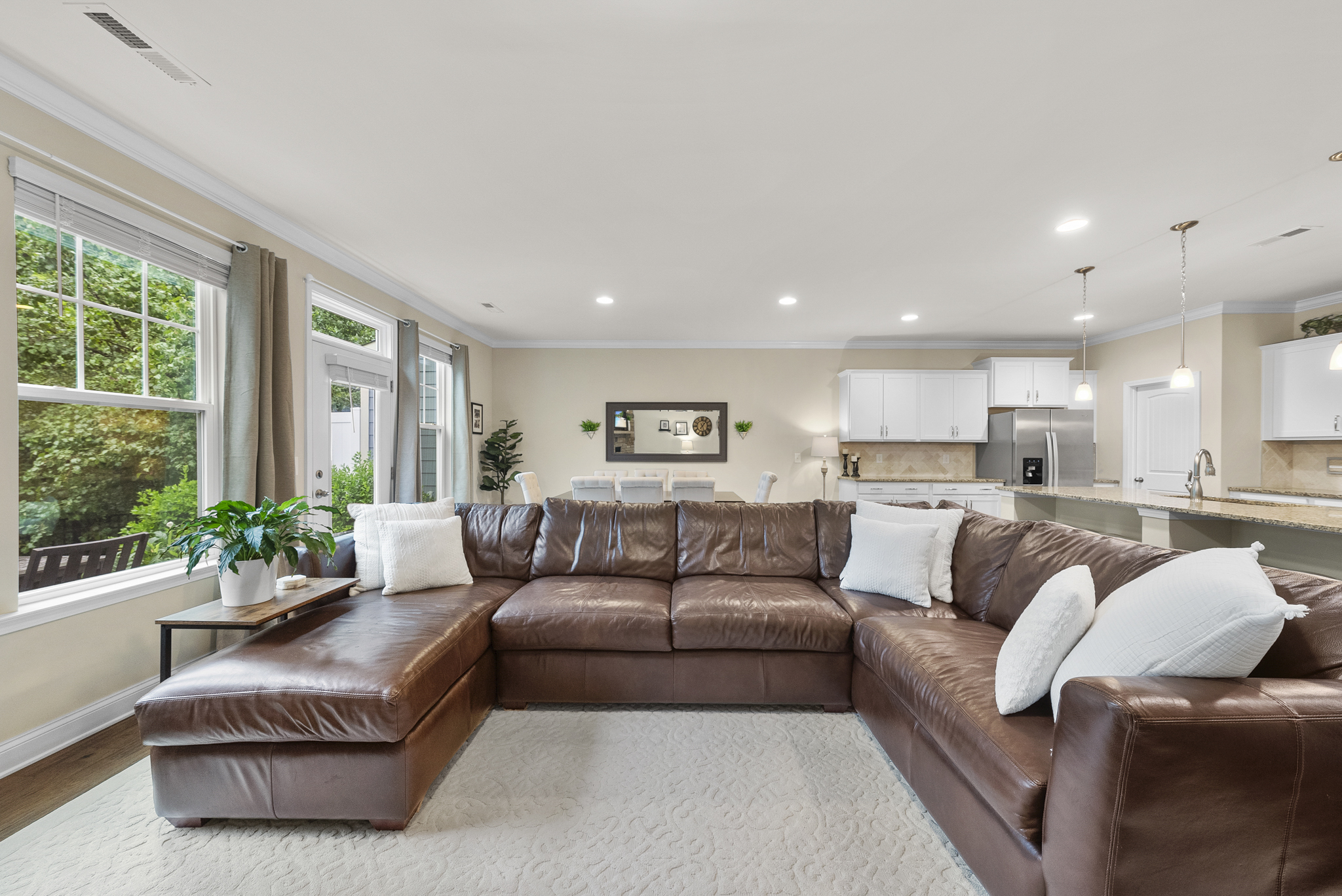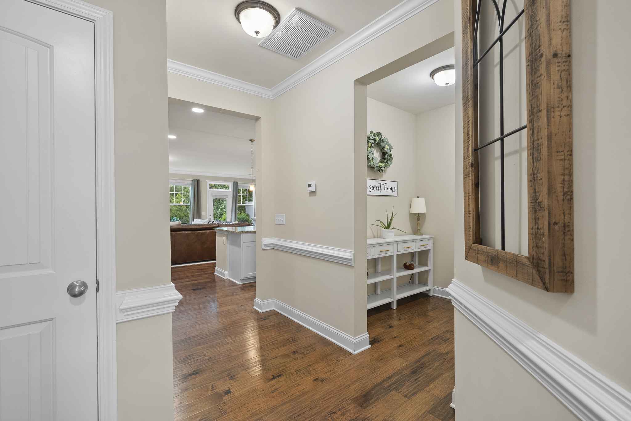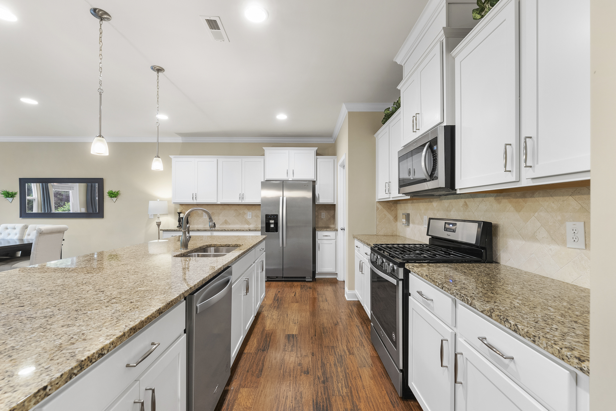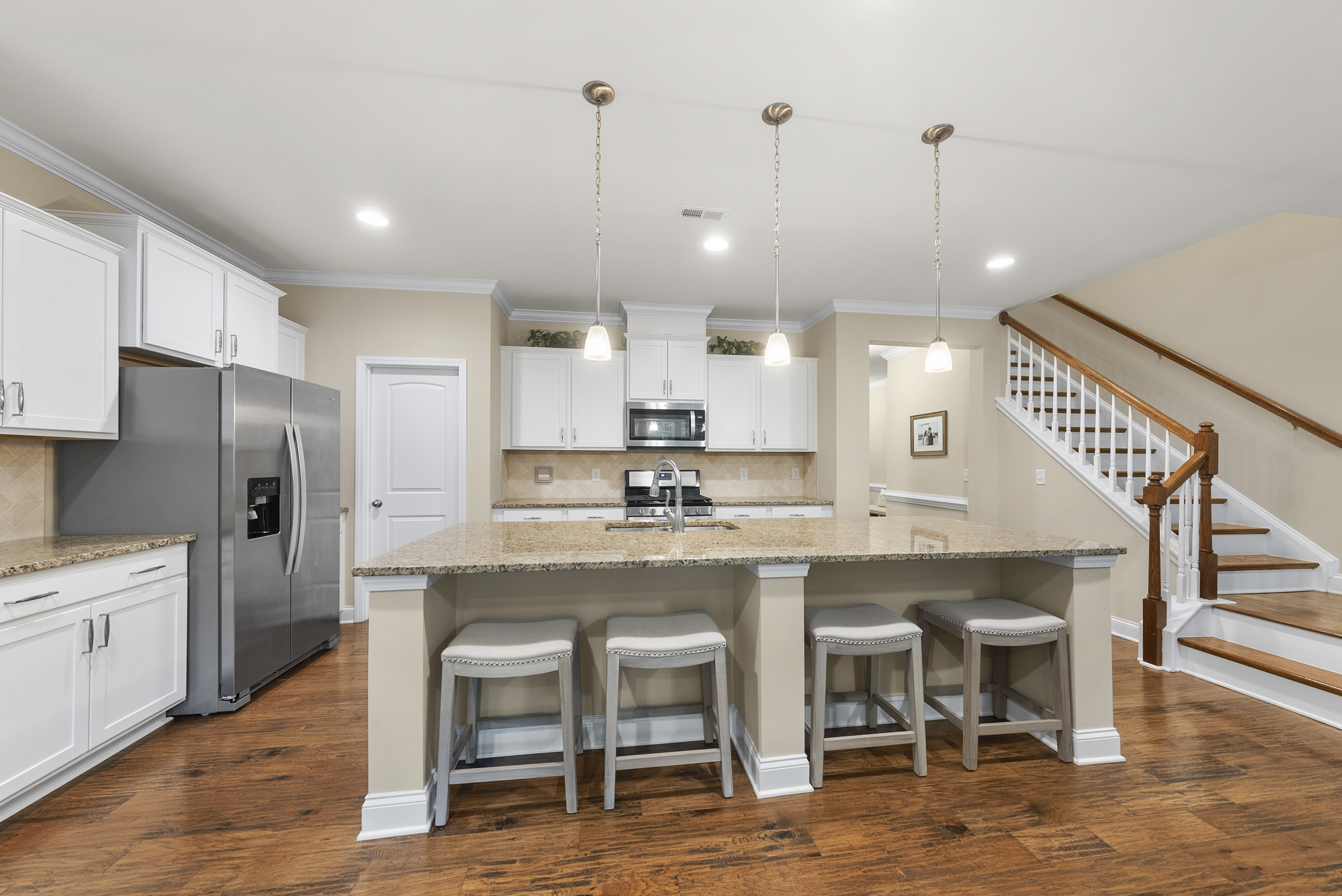 Welcome to this beautiful 3-bedroom, 2.5-bath townhouse with bonus room and 2-car garage! Come inside and notice the beautiful hardwoods, crown molding, and an open layout. The kitchen offers a large center island, granite countertops, gas range, and stainless steel appliances. The spacious family room has abundant natural light and a stone gas-log fireplace. The dining area is perfect for guests and easily fits a full-size table. Rounding out the first floor, there is a drop zone/mudroom and a convenient half bath. Upstairs, the large primary suite boasts tray ceilings, big windows, and two walk-in closets. The large primary bath includes double vanities, a glass walk-in shower, and a private water closet. Two additional bedrooms feature ample closet space and share a full bath with dual vanities. A laundry room and a spacious bonus room complete the second floor. Out back, relax on the patio that backs up to a wooded area for added privacy. Additionally, there is an outdoor storage room attached. This amazing propertyy is in a great location near shopping, dining, entertainment and major Triangle thoroughfares! Don't miss this well kept and comfortable home!